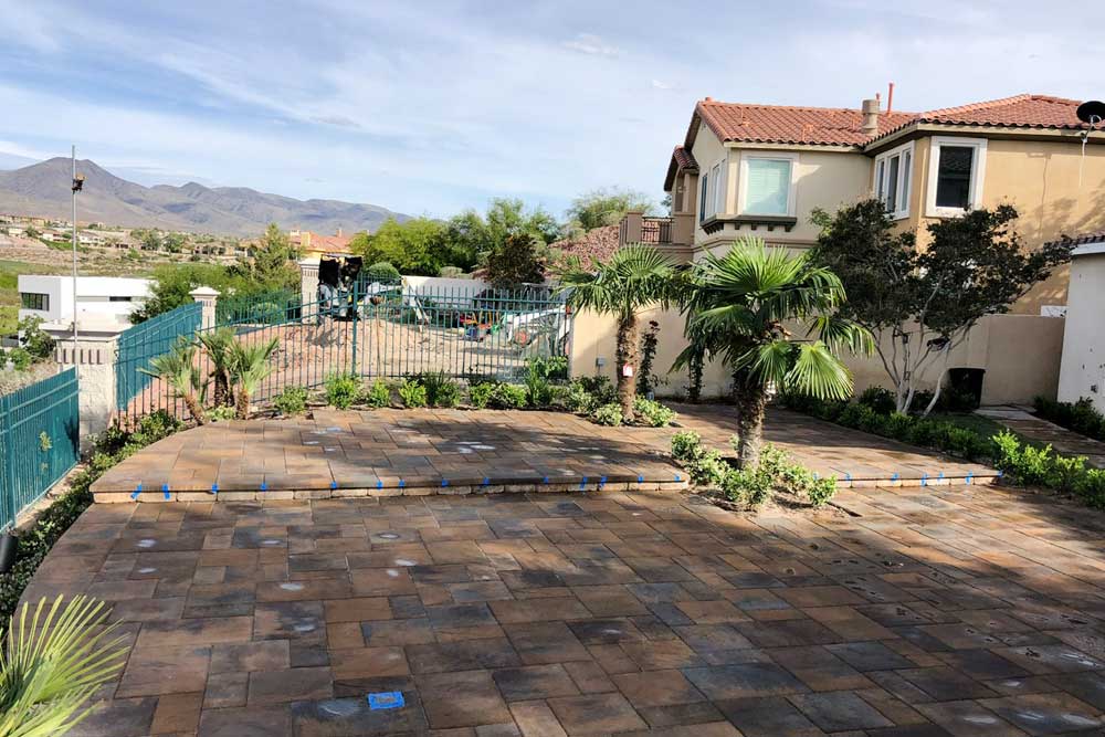 The homeowners wanted to replace their practically non-existent backyard with something functional that allowed them to have family meals and enjoy the sunset. We provided them pavers that complemented each other nicely.The final touch in this yard were the palm trees which were used to add both volume and depth to the yard.